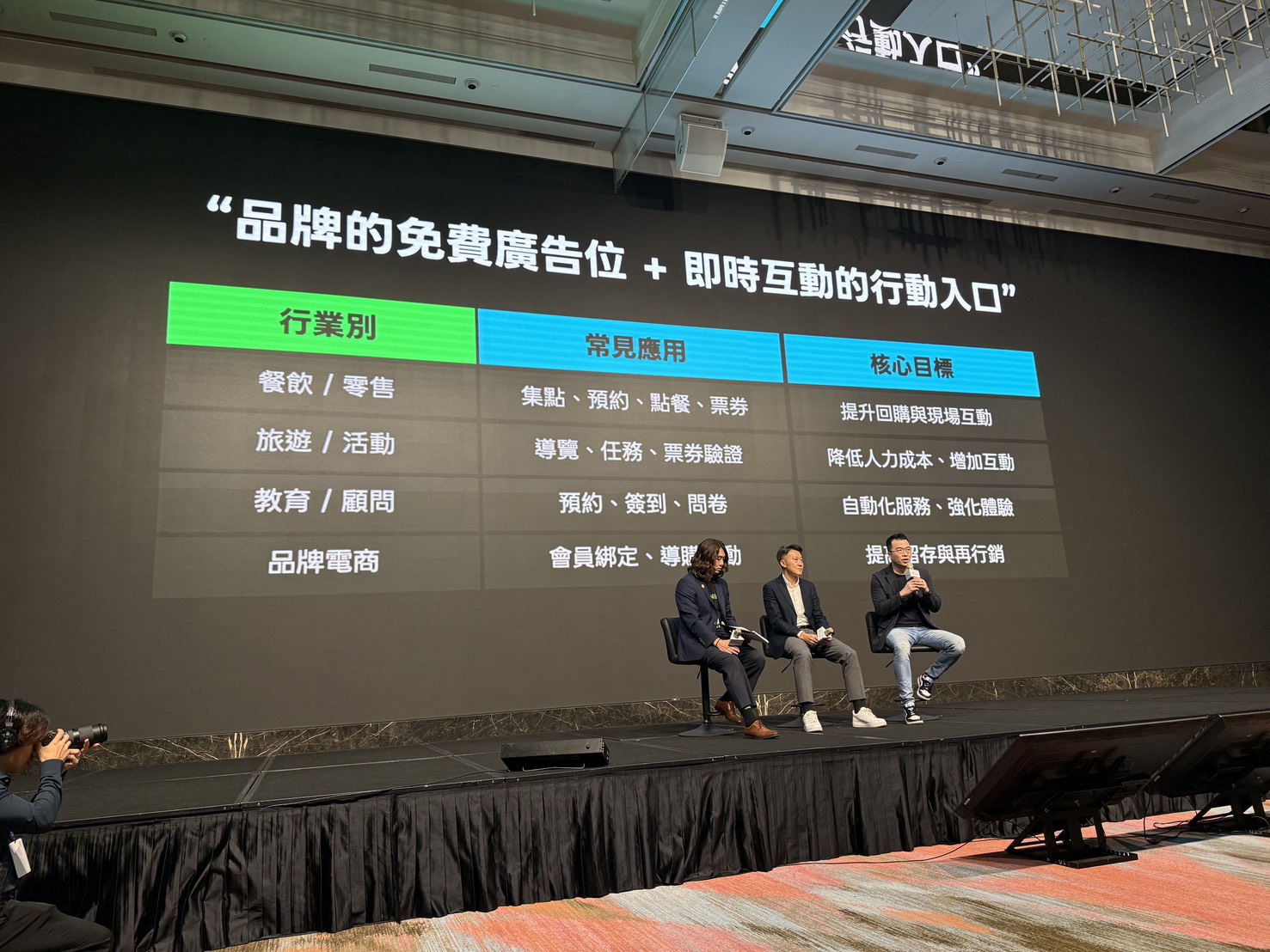 Paul 接著分享跨產業的典型應用,說明 MINI App 本質上是品牌在 LINE 中的「免費廣告位」+「即時行動入口」。以餐飲與零售為例,MINI App 能用於集點、預約、點餐、票券兌換,讓顧客從線上導流至線下消費更加順暢;在旅遊與活動領域,它能支援任務闖關、票券驗證、導覽服務,有效降低人力成本並提高互動深度;在教育與顧問產業,它能支援預約、簽到、問卷等,使服務流程自動化;而品牌電商則能透過 MINI App 的會員綁定與導購流程提升回訪率與轉換率。