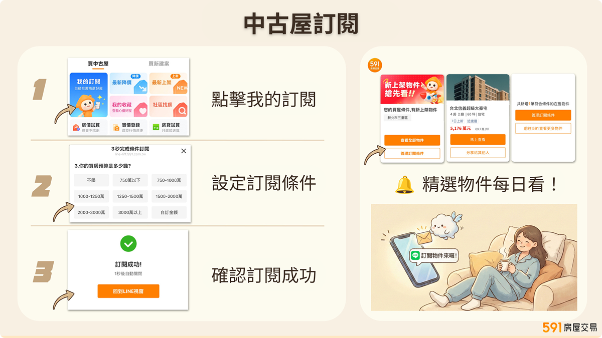 除了精準推送訊息外,為了解決用戶的資訊痛點,591 也在官方帳號內靈活運用圖文選單,提供如「實價登錄查詢」與「房貸試算」等實用的決策工具。更推出「中古屋訂閱」功能,當用戶設定預算、地點、格局等條件後,若有符合條件的物件,便會透過 LINE 官方帳號推播、將物件透過卡片的方式整理送到用戶眼前,解決用戶必須手動搜尋的麻煩。