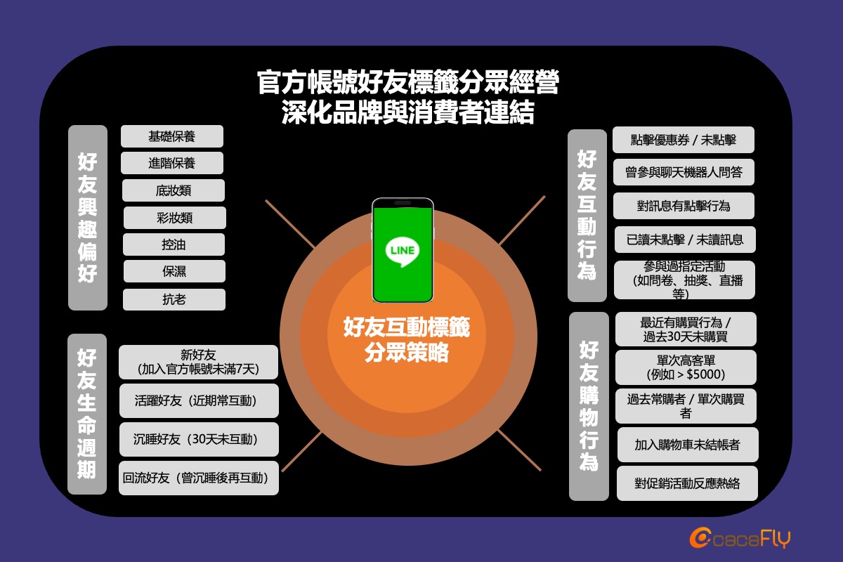 利用 LAP 帶進來的好友,若只收到統一的罐頭訊息,封鎖率將會居高不下 。cacaFly 建議依標籤進行高度客製化互動 :