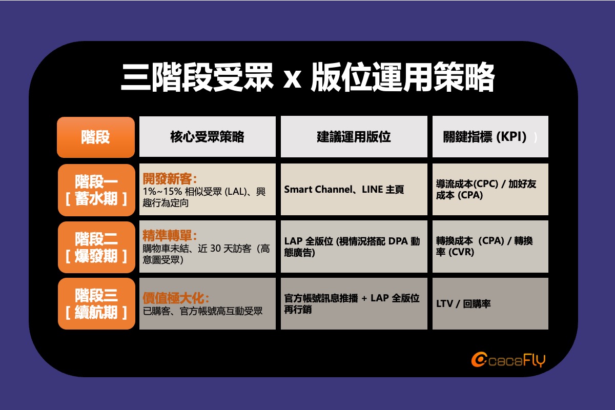 成效要提升,不能只靠預算暴力加碼。我們建議將受眾拆分為三階段,配合對應的版位與 KPI 精準佈局。