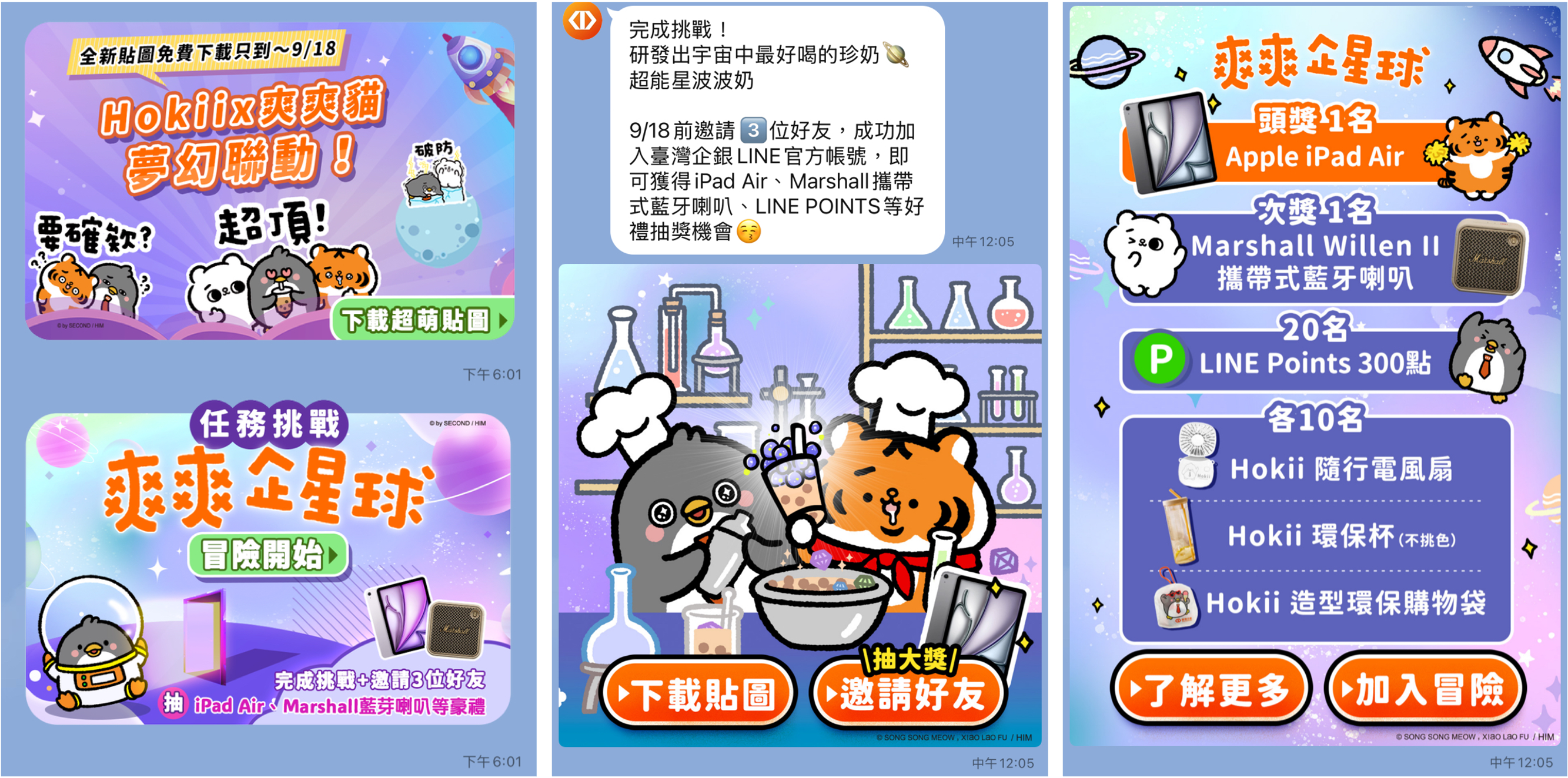 Hokii 化身宇宙嚮導,帶領使用者探索「爽爽企星球」,透過情境任務與遊戲機制傳遞 Hokii 數位服務「輕鬆、溫暖、便利」的品牌價值,同時透過創意機制增加好友互動感。