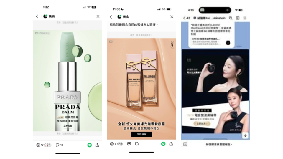 希望透過 LINE 生態圈的行銷曝光,吸引 LINE 的活躍用戶,藉由廣告曝光吸引到線上線下消費。因此選擇多元的 LINE 廣告版位,特別會選用保證型廣告「滿屏」方案,可以讓廣告素材占滿螢幕,讓受眾在最短時間內記住品牌及產品。Alan LEE 提到,因為美妝品牌的廣告素材相當精美而且能抓住消費者眼球,透過 LINE 保證型廣告的曝光,可以讓 SOV 衝到最高。