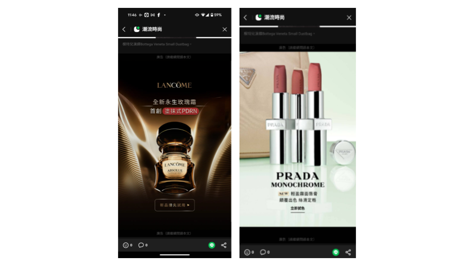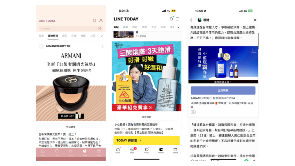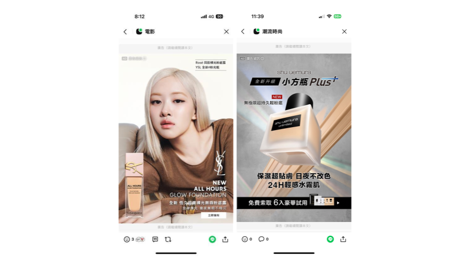 另外也會選擇位於 LINE TODAY(新聞) 頻道的大版位廣告版位—LINE Backdrop。「Backdrop版位相當適合美妝或奢華品牌,能用來傳遞漂亮或華麗的風格,加上版面大尺寸,可以讓我們完整呈現想傳達的視覺效果。」