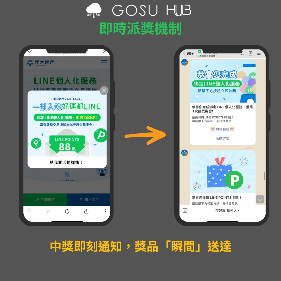 為徹底解決贈獎延遲、客戶無感的痛點,元大銀行在行銷活動期間導入 GOSU HUB 的任務抽獎機制,完成綁定即可抽 LINE POINTS,獎勵即時入帳的機制也讓參與率飆升!