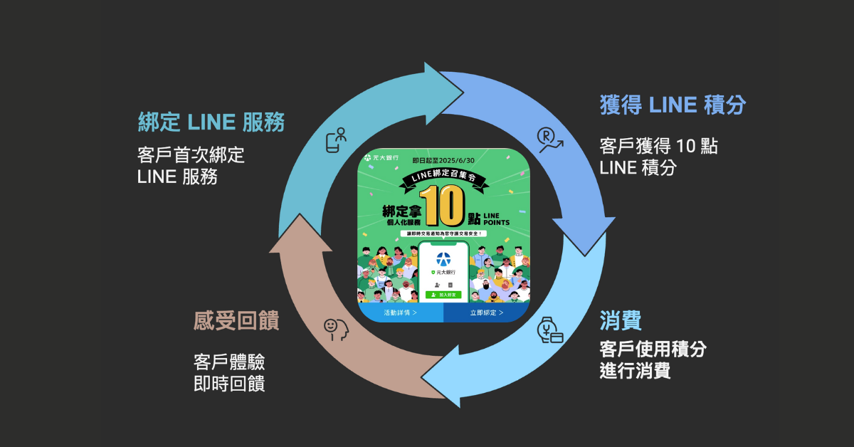 • LINE POINTS 立刻入帳:如「LINE 綁定召集令」活動,元大客戶首次綁定 LINE 個人化服務,LINE POINTS 10 點立即到手,消費後立刻感受回饋。