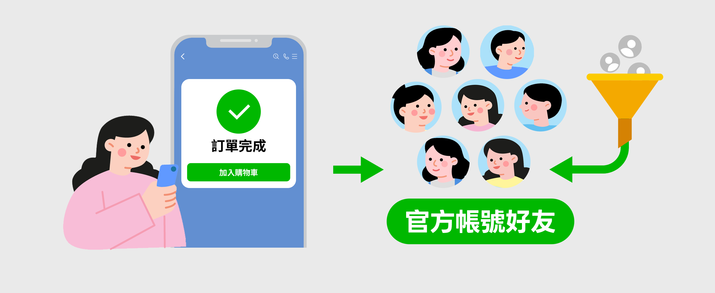 賣家可將原本匿名的社群成員,在下單時自動加入官方帳號成為好友, 將社群的「過客」轉化為LINE官方帳號的「長期熟客」。