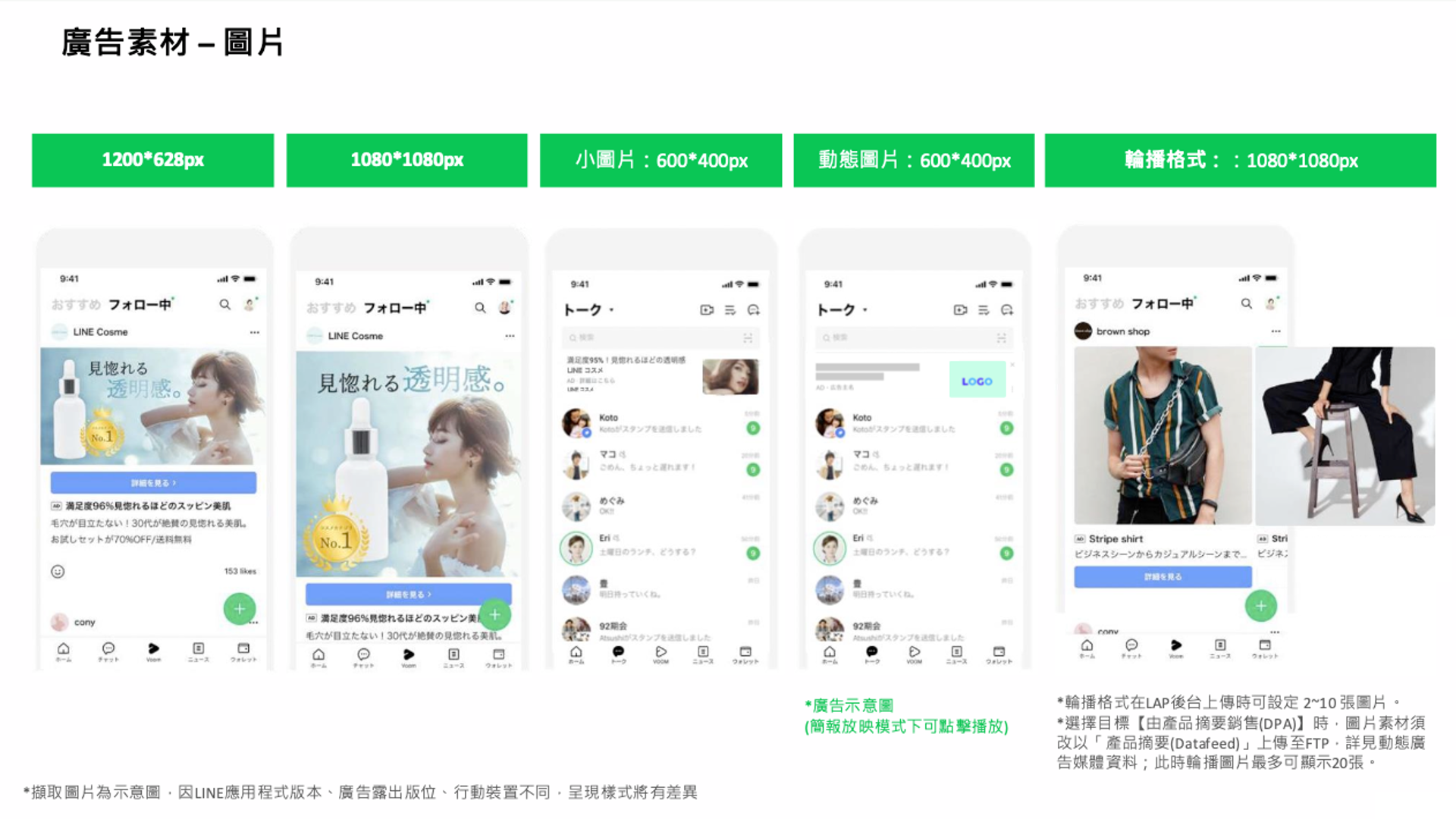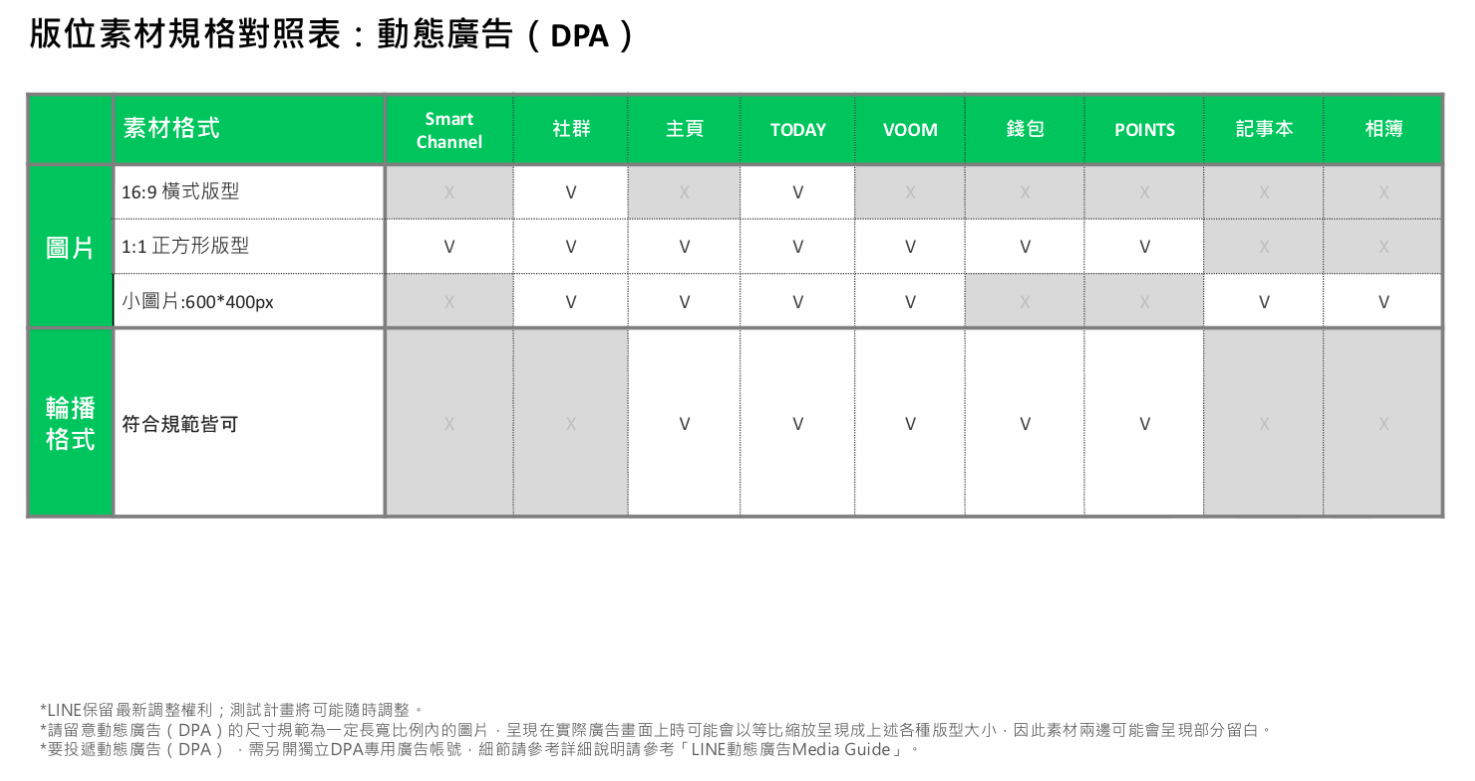 另外,LAP 的廣告格式會決定曝光的版位,商家可以針對自己想要露出的版位中,製作符合的素材規格,像是想要讓廣告出現在聊天室上方,則可以透過小圖片 (600x400) 的製作。