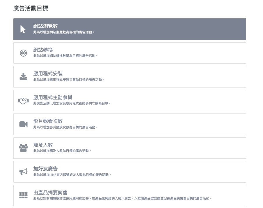 開立LAP 有八大廣告活動目標,分別針對網站、應用程式、影片、觸及人數與官方帳號都能達到不同的行銷目的。