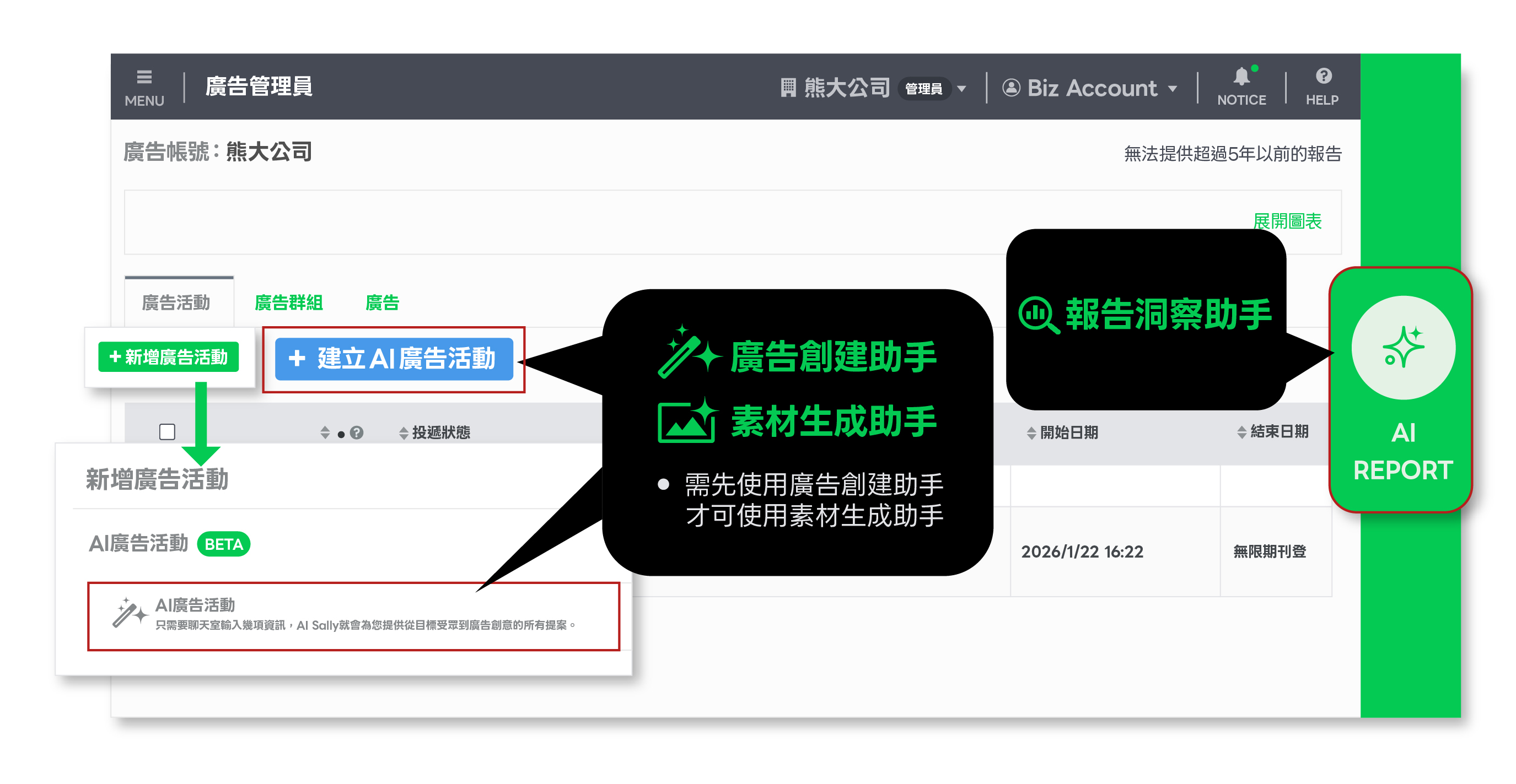 Step 2: 進入廣告管理員介面,您將看到「建立 AI 廣告活動」 及 「AI Report」按鈕