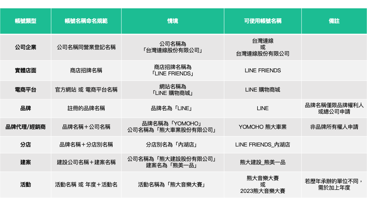 認證帳號名稱原則上必須與「公司/商家名稱」 、「實際店名」、「網路平台」及「品牌」名稱一致,「不造成品牌侵權或誤導使用者」 為最高原則,能讓好友立即辨認的服務名稱。