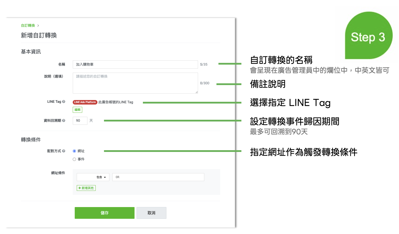 在LAP 系統中預設的「轉換」,就是 LINE Tag 埋設轉換代碼設定所定義的行為,商家可以自行決定此處的最終轉換的觸發條件 (通常可以設定為完成購買),但在數位廣告中消費者的行為並不是只有完成購買,在完成購買之前,肯定會經過不同的事件(e.g.瀏覽頁面、加入購物車...),而「自訂轉換」的功能就是協助我們將中間的事件定義清楚。