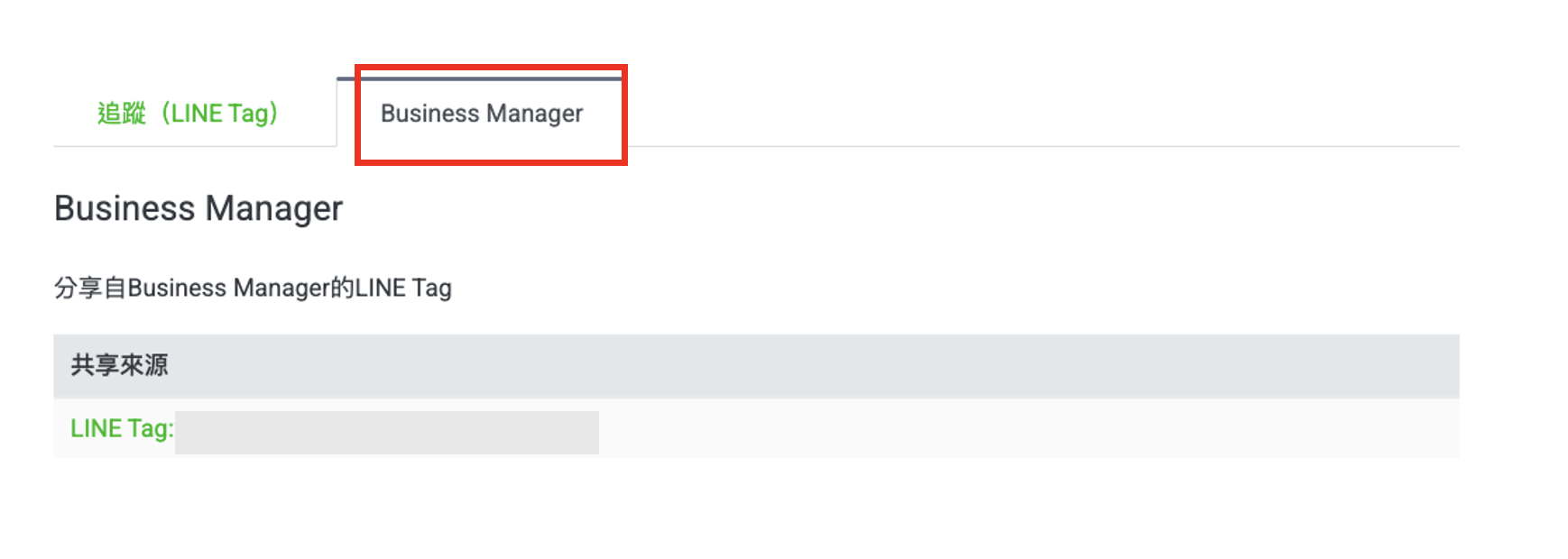 於 LINE 企業管理平台 (Business Manager) 設定完成後,至 LAP 追蹤 (LINE Tag) 中的 「Business Manager」 分頁即可看到透過 LINE企業管理平台 (Business Manager) 分享至 LAP 廣告帳號的共享 LINE Tag,後續可利用該共享 LINE Tag 建立網站流量受眾或自訂轉換。
