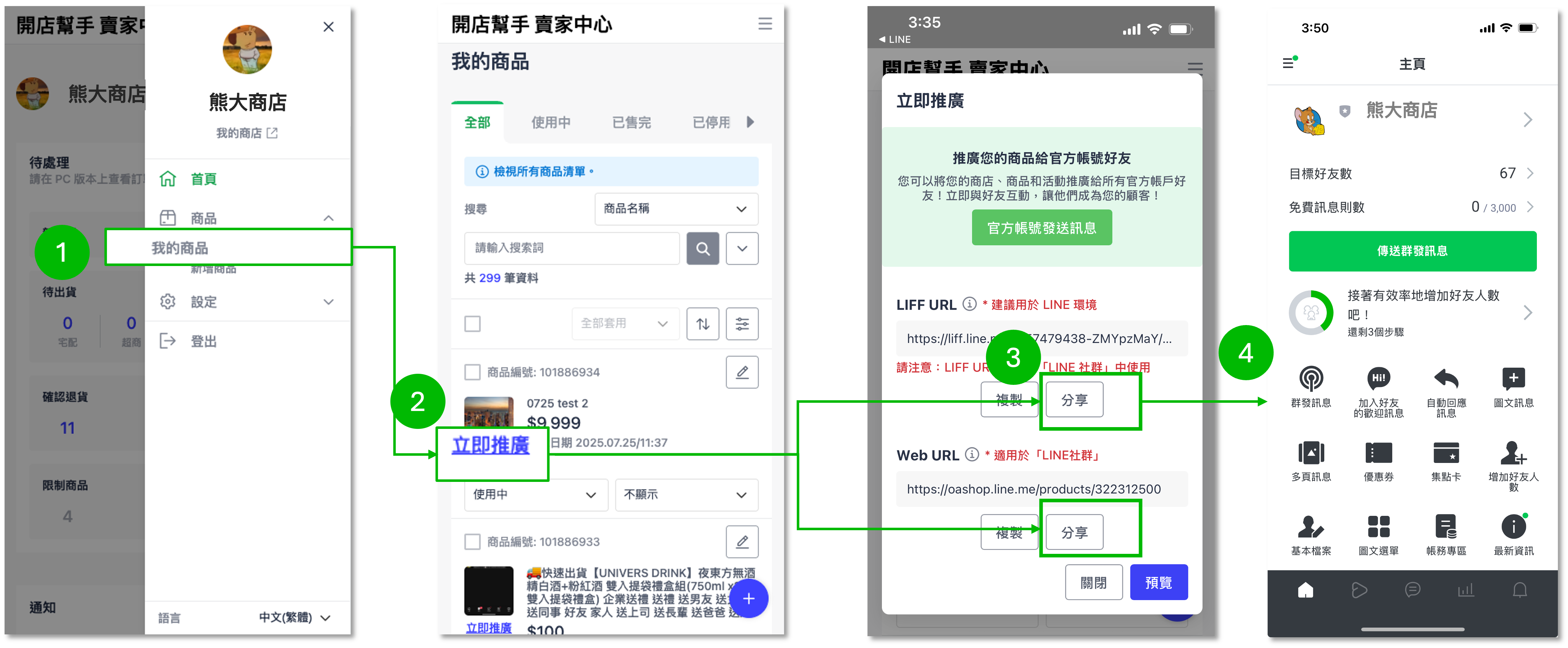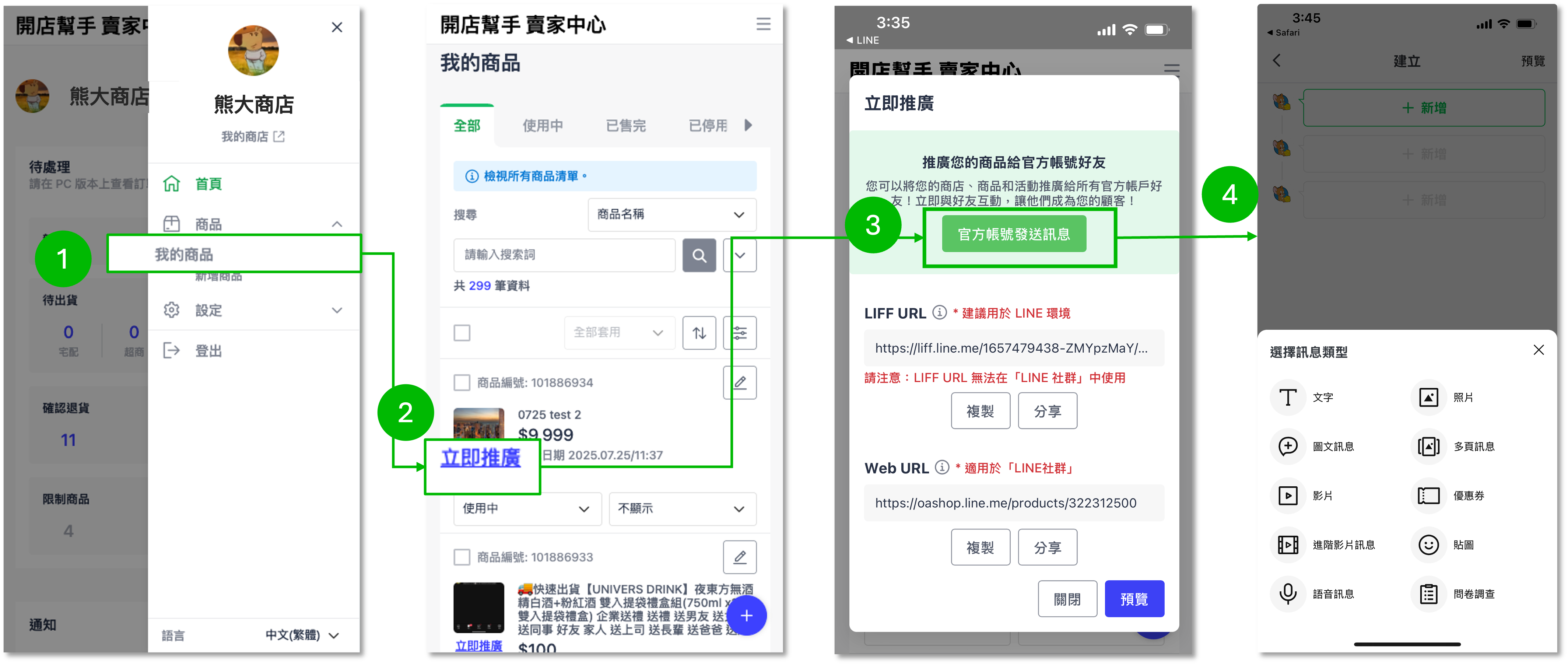 您可以從 LINE 官方帳號 APP 進入手機版開店幫手賣家中心,步驟如下