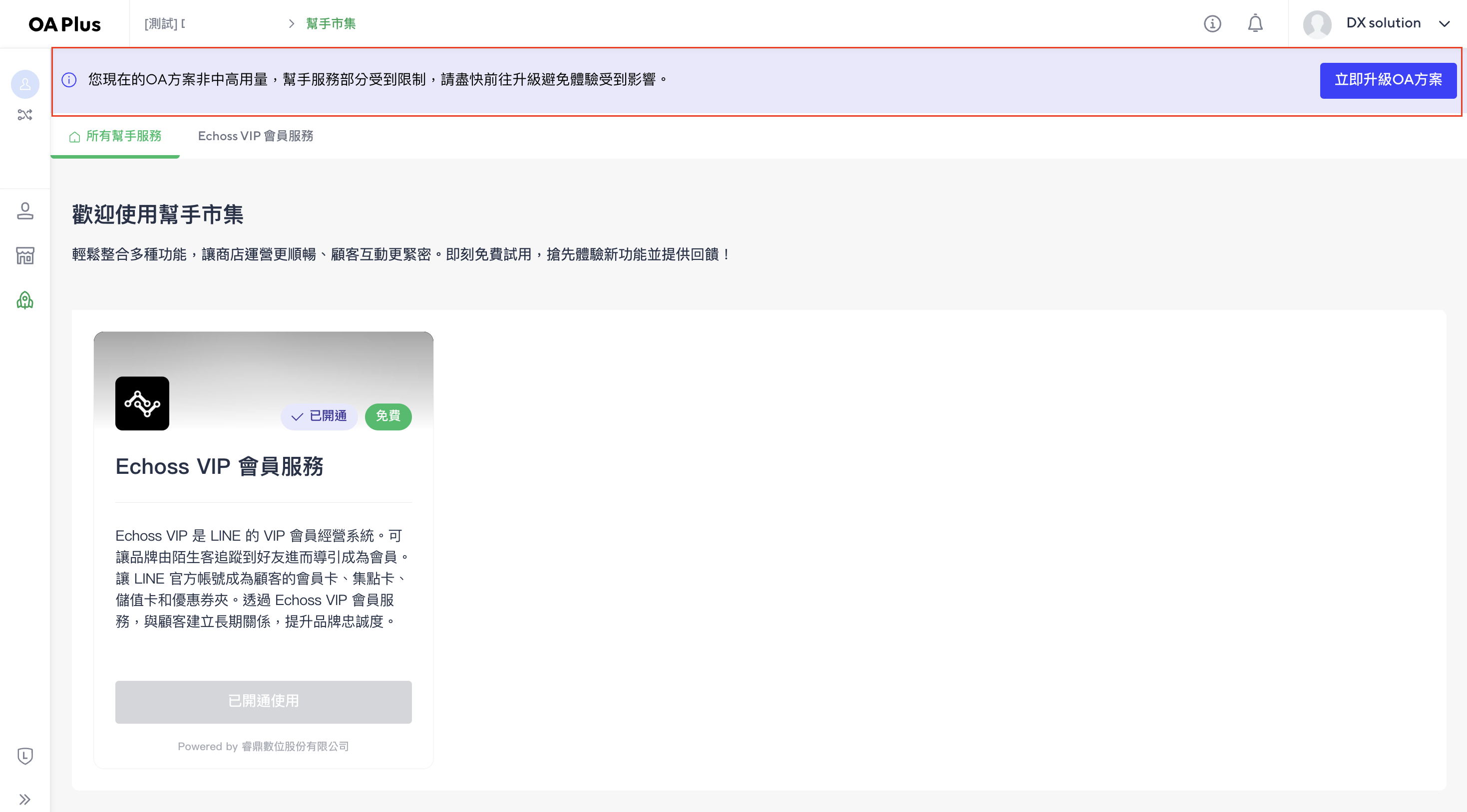 若官方帳號從中高用量轉為輕用量時,您將在幫手市集後台看到以下提醒,您可進入幫手市集內的各個系統,但是部分功能將受限制。
