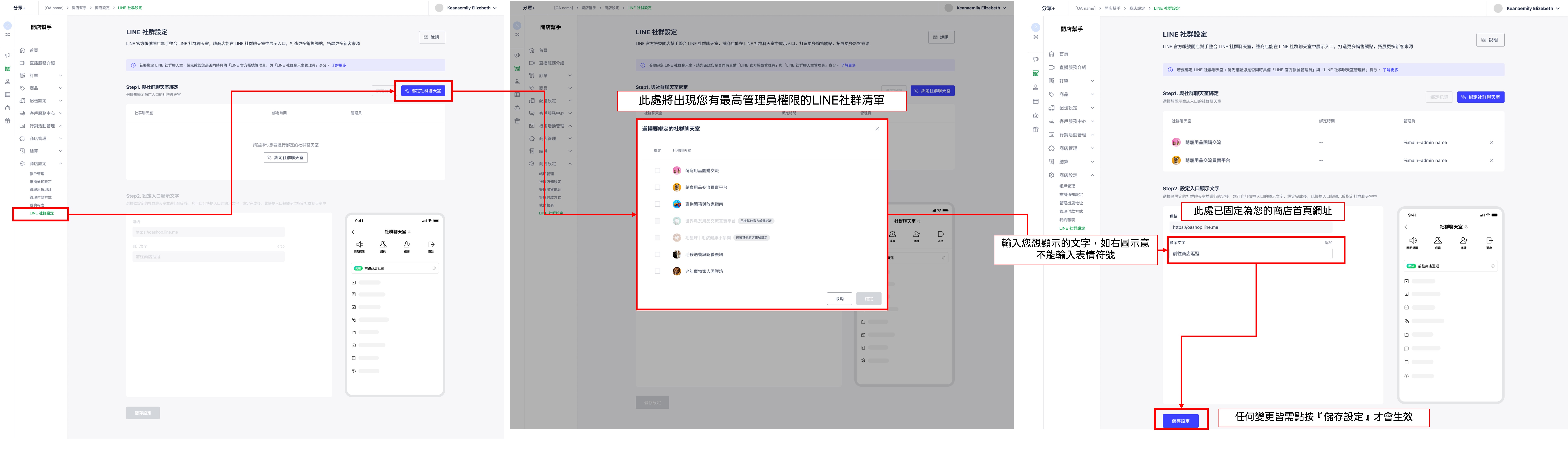 須先申請開通 LINE 官方帳號開店幫手(如何申請)並於開店幫手賣家中心設定。 路徑:LINE 官方帳號後台 > 開店幫手 > 商店設定 > LINE 社群設定。 步驟 1 : 選擇欲綁定的社群聊天室。僅能選擇您具有最高管理員權限的社群,無法選擇非最高管理員權限的社群。 步驟 2 : 設定出現在社群聊天室入口的顯示文字。入口網址已固定為您的 LINE 官方帳號商店首頁網址。 注意:設定完畢,或後續進行任何設定調整,都必須點按「儲存設定」才會生效