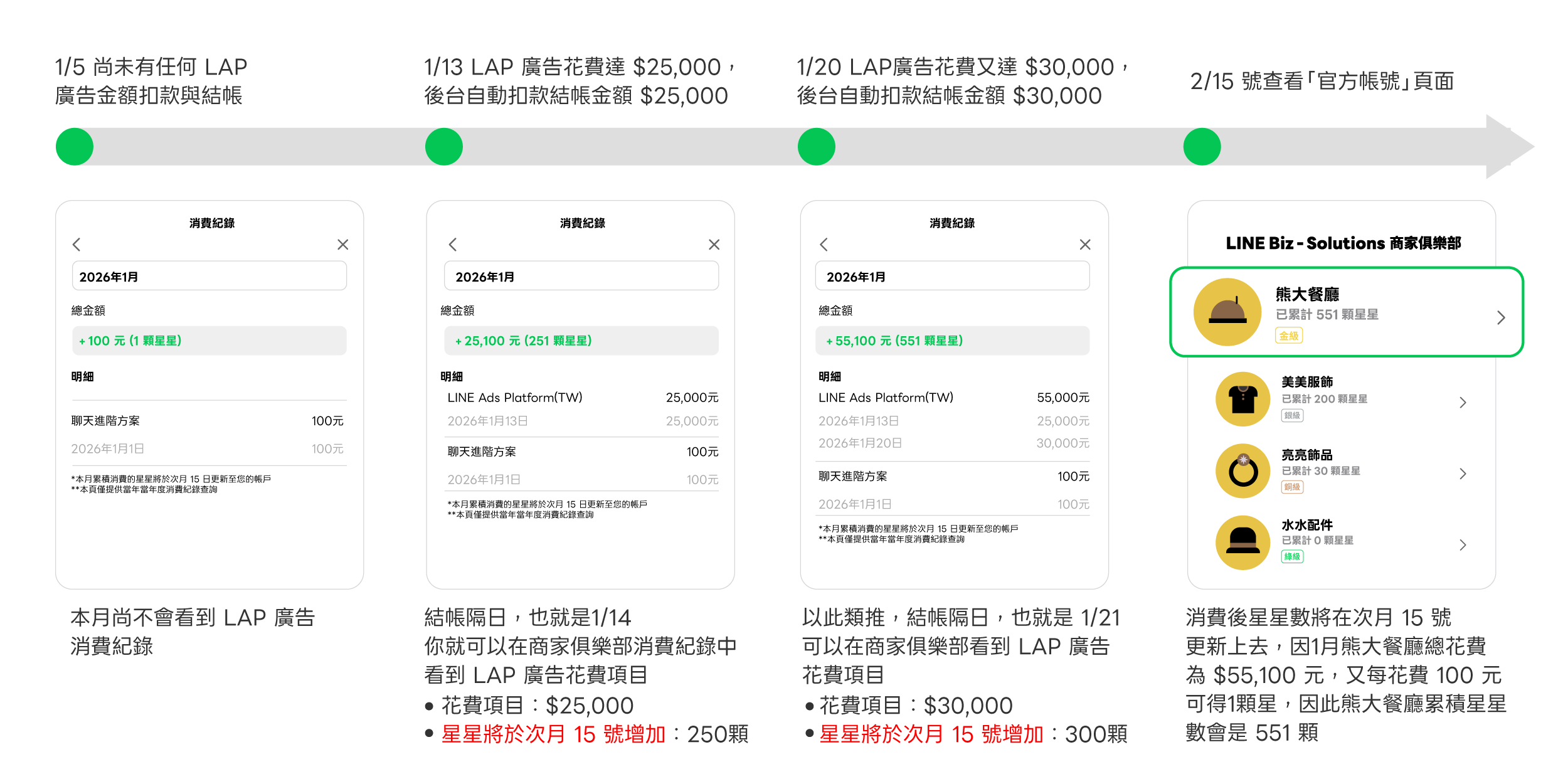 LAP 廣告花費的星星累積數會以實際扣款結帳金額為主,結帳隔日即可在消費紀錄中確認花費金額,但星星將統一是於次月15號更新上一個月的累積數量。 ( LAP 廣告結帳方式可點此參考) 消費紀錄:結帳隔日更新 星星計算:消費後次月15日更新至帳戶