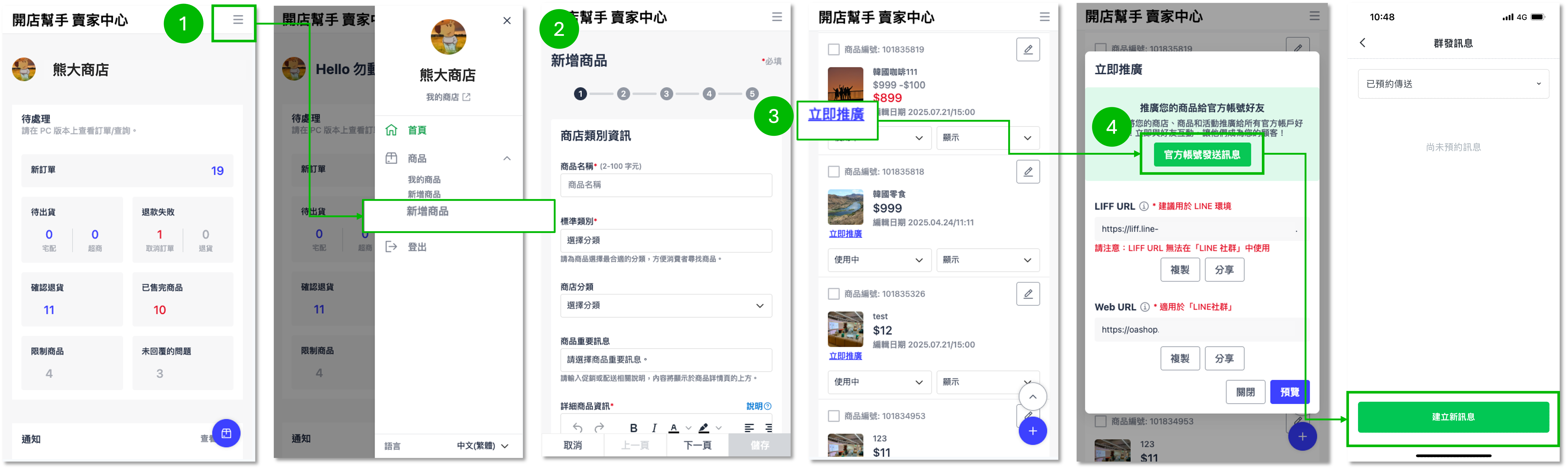 - 打開 LINE 官方帳號APP,登入手機版賣家中心(登入方法請看常見問題),進入功能選單點選「新增商品」