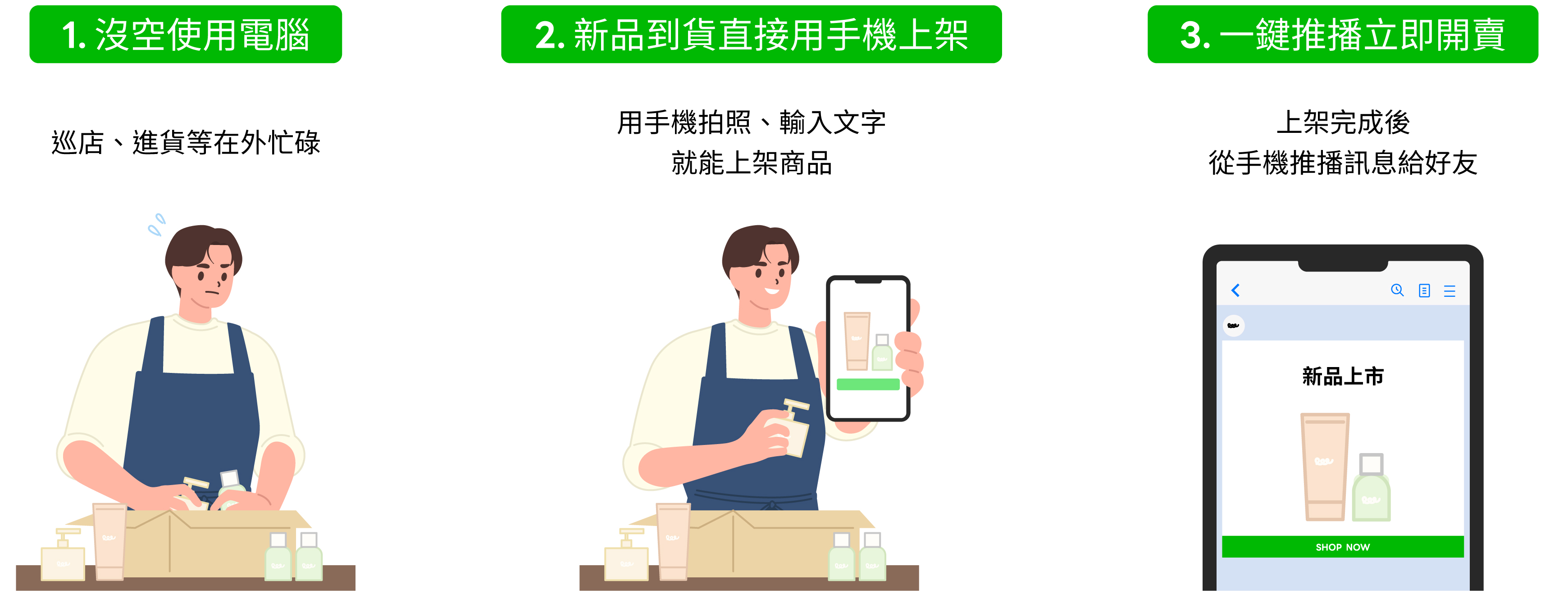 你是否也常因在外忙碌,沒有空能坐在電腦前上架新品?此時若剛好有新品到貨,只要用手機拍個照就能上架商品,甚至一鍵從手機推播訊息給好友,輕鬆上架、輕鬆宣傳。