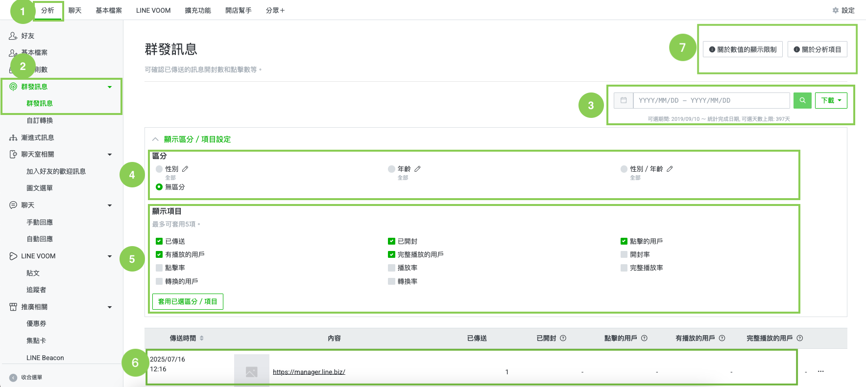 *透過API發送之訊息也將顯示於此表格,若您未啟用Messaging API但此處出現Push訊息,則可能為LINE官方帳號開店幫手發送之訂單相關訊息(說明),或是分眾+ 抽獎加好友幫手發送之抽獎訊息(說明)。