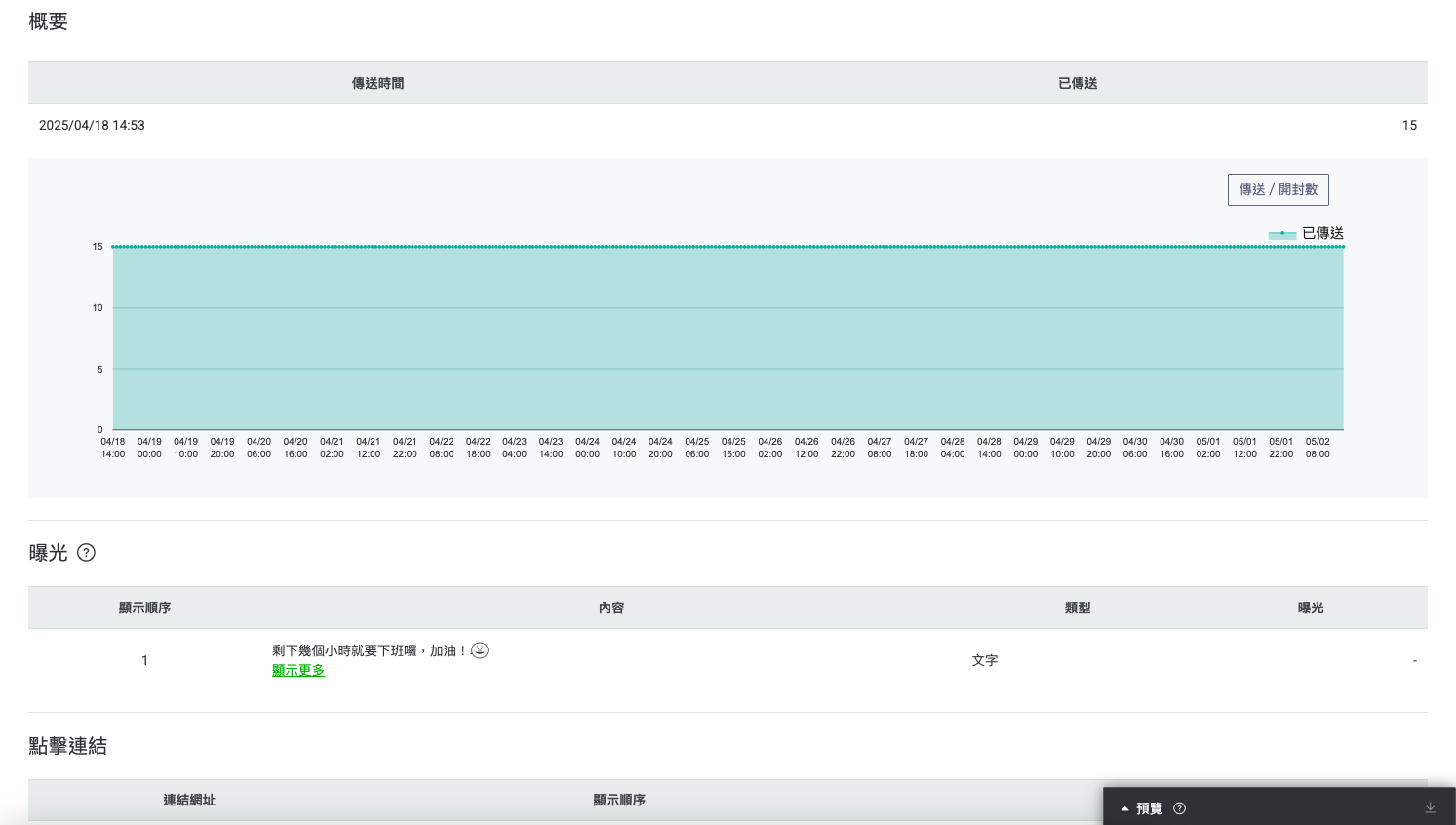 ⑥ 可以查看群發訊息詳細內容數據列表,當點擊其中一次的群發訊息則會出現詳細的每日趨勢圖數據(如下圖)