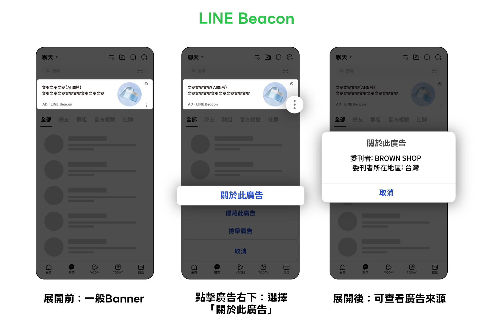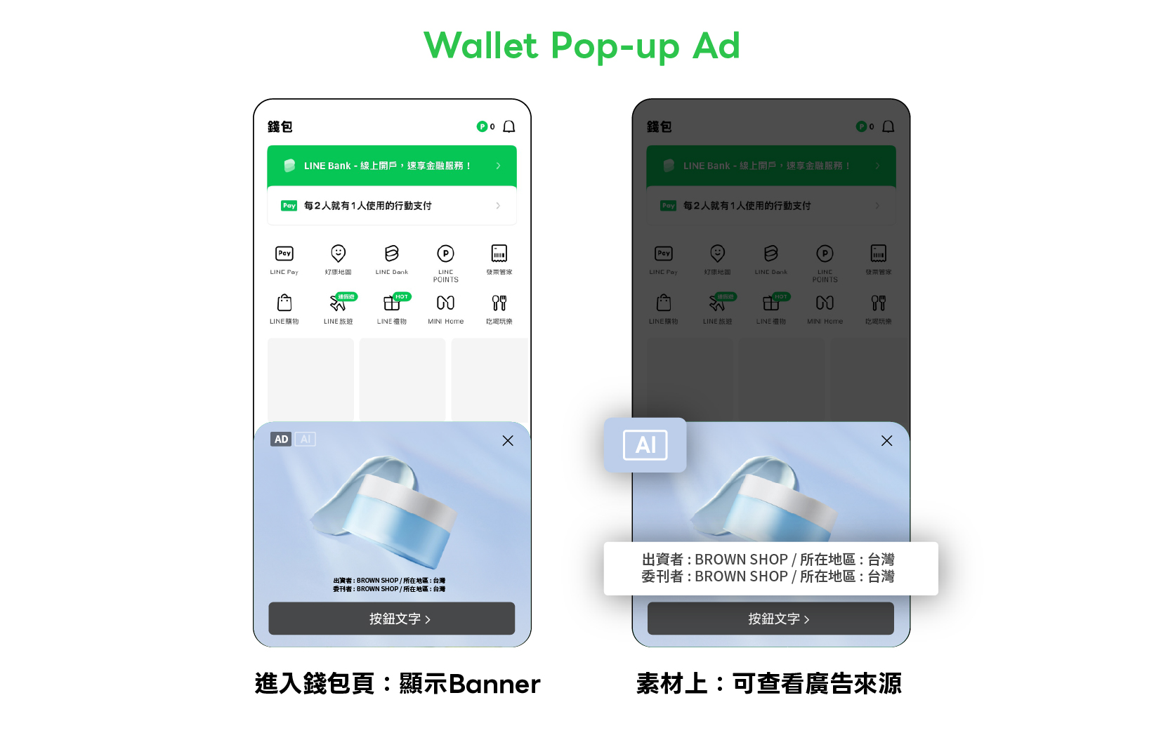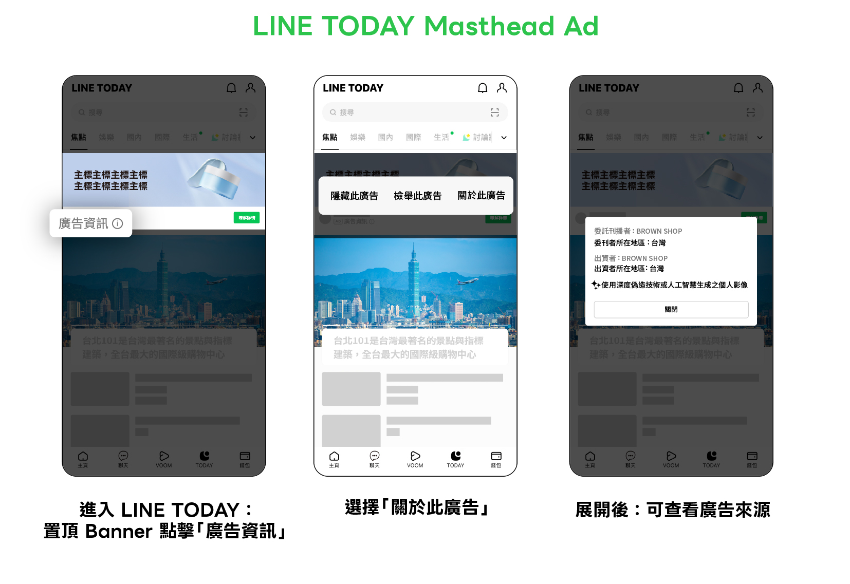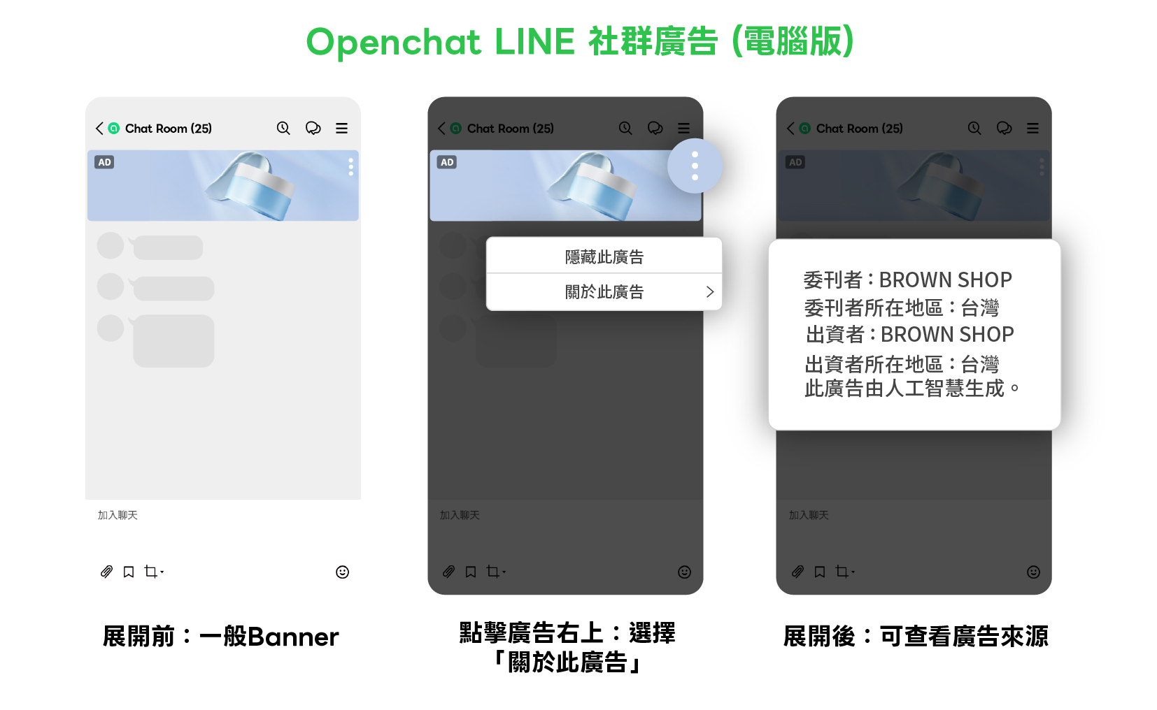 為配合《詐欺犯罪危害防制條例》及相關子法規之要求,並秉持 LINE Taiwan 防範詐騙、保障用戶安全之立場,針對 LINE 廣告之刊登規範進行更新。針對刊登之廣告內容,除原有禁止刊登之產品與服務類型外,所有廣告版位之上架素材,須明確揭露廣告來源資訊;相關揭露內容將依版位不同,呈現於對應位置。
