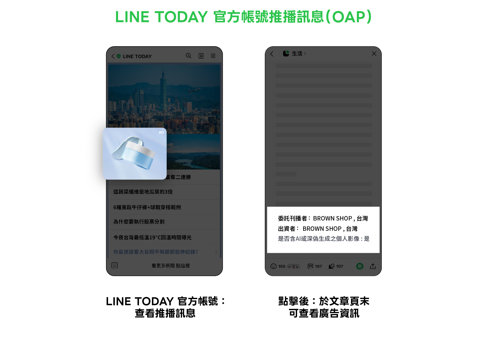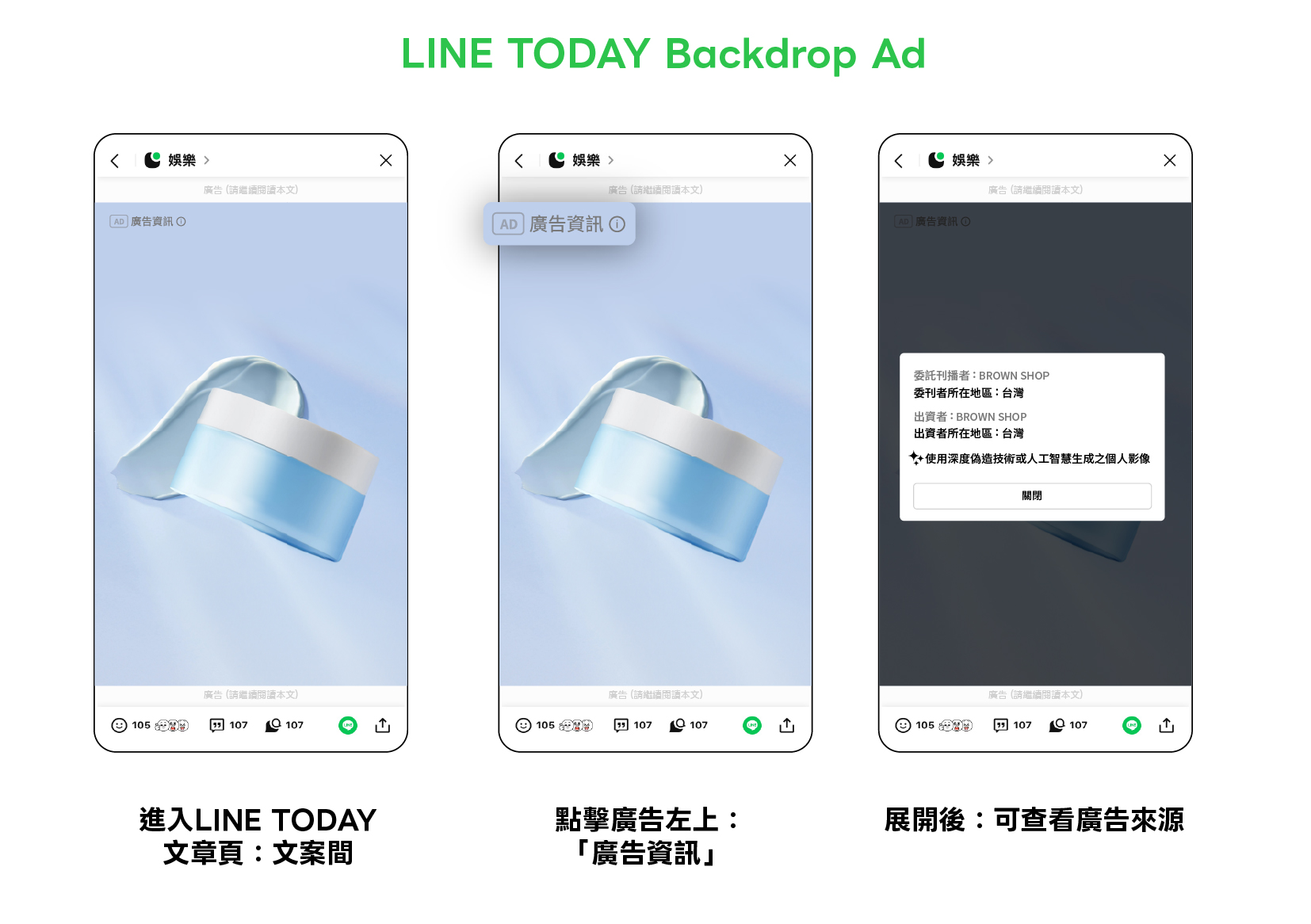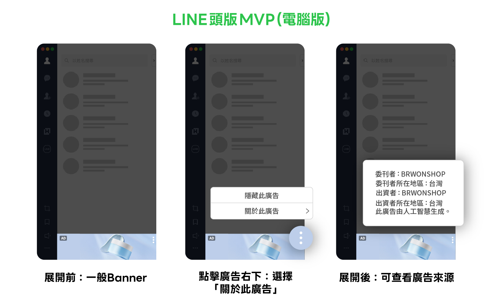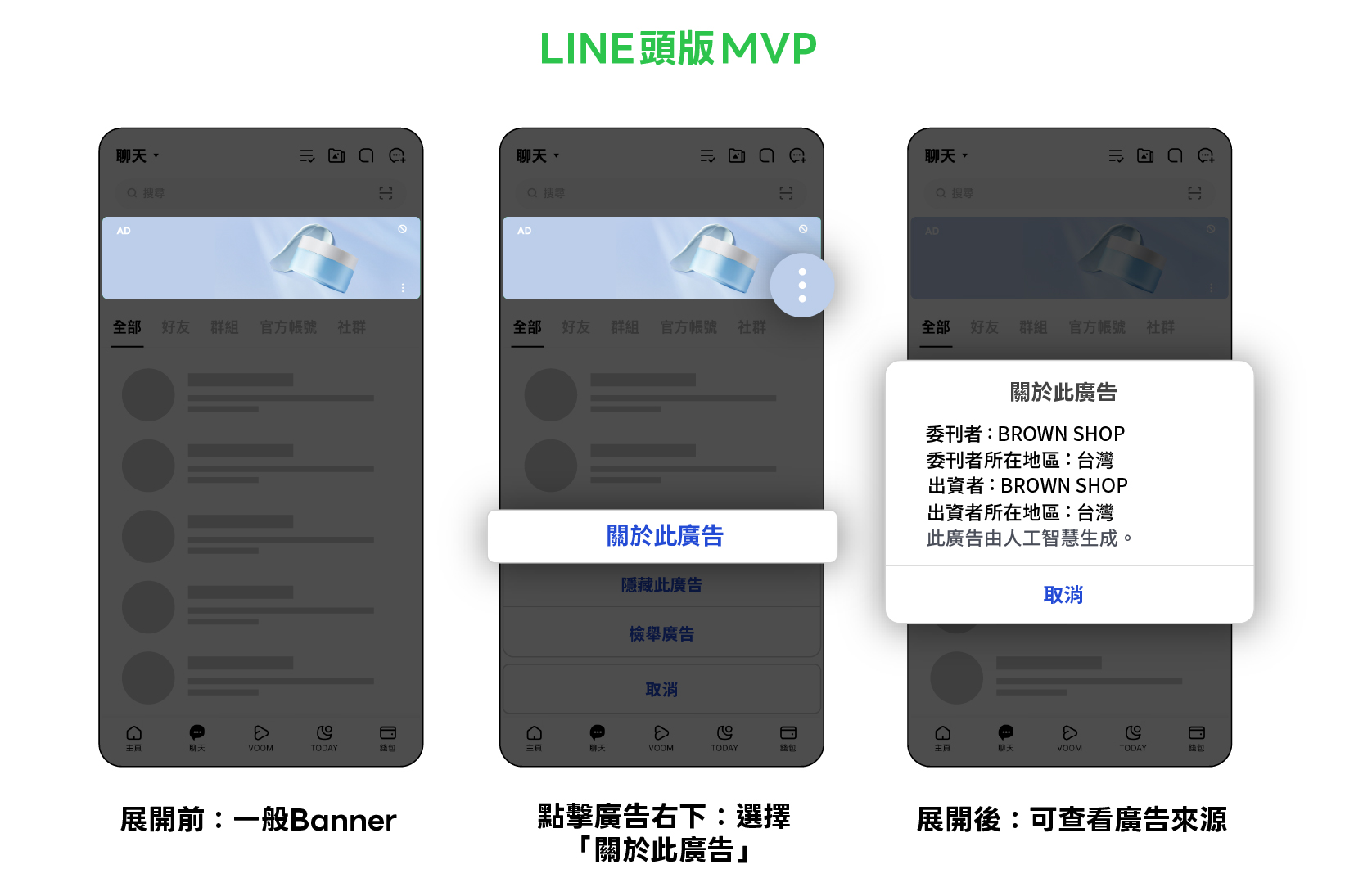 為配合《詐欺犯罪危害防制條例》及相關子法規之要求,並秉持 LINE Taiwan 防範詐騙、保障用戶安全之立場,針對 LINE 廣告之刊登規範進行更新。針對刊登之廣告內容,除原有禁止刊登之產品與服務類型外,所有廣告版位之上架素材,須明確揭露廣告來源資訊;相關揭露內容將依版位不同,呈現於對應位置。