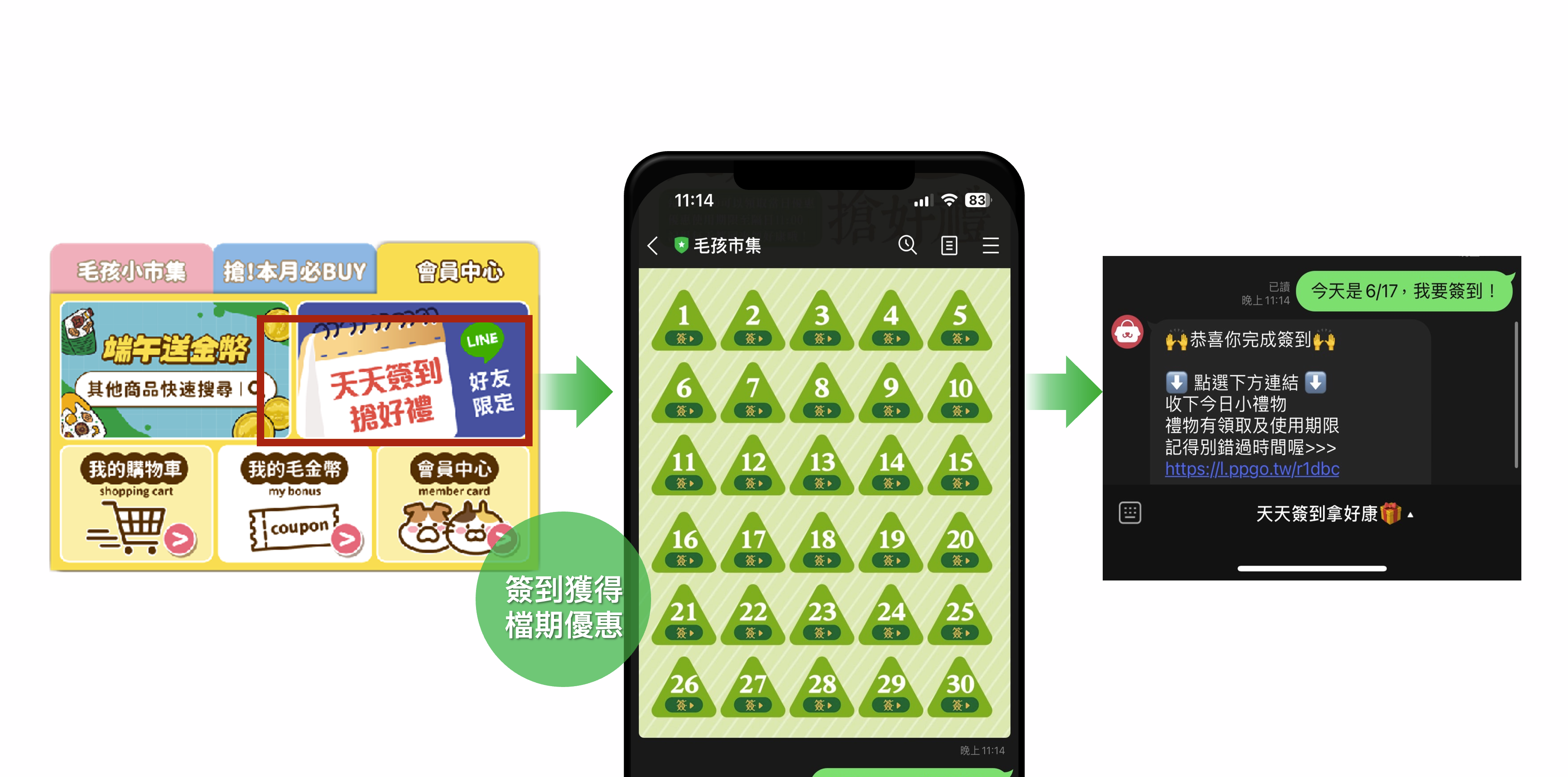 他們在電商大檔倒數前,在LINE上推出了限定簽到領好禮的活動。