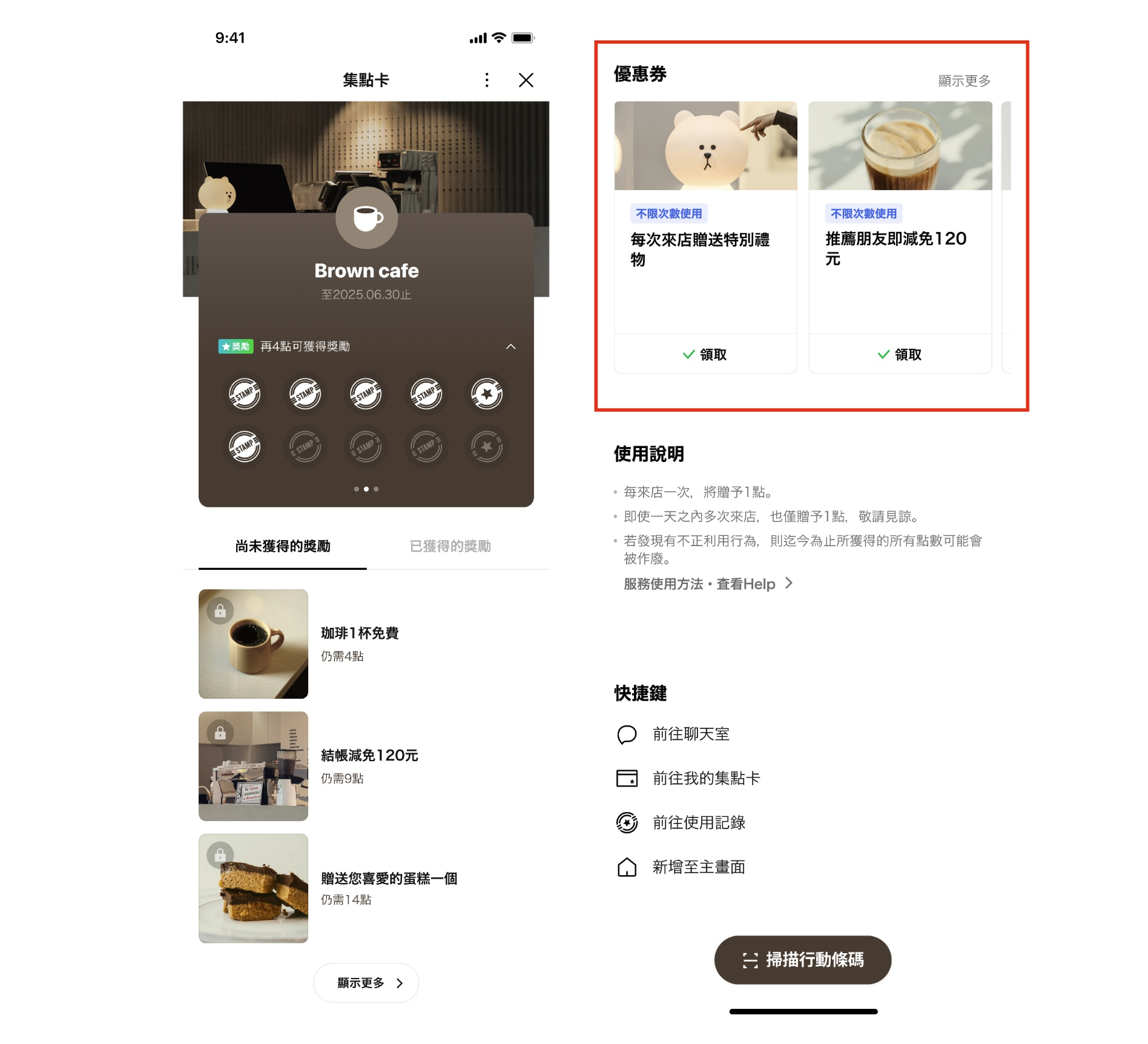 你看在LINE集點卡畫面上還可以查看可用的優惠券,預防客人忘記使用。